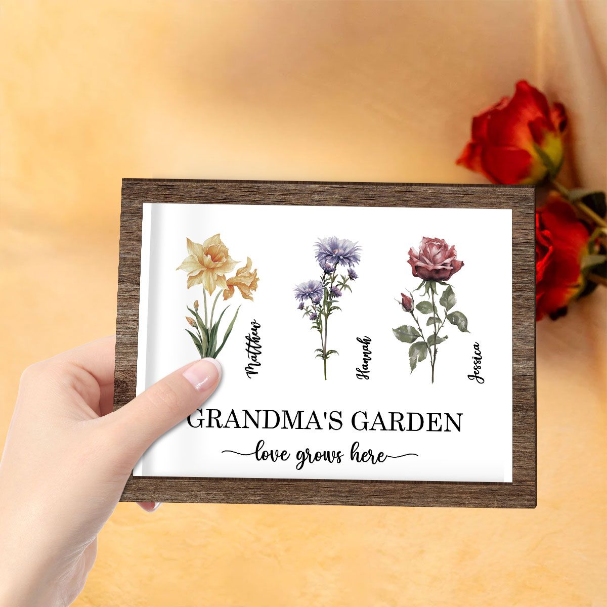Grandma's Garden Love Grows Here Birth Month Flower Personalized 2-Layered Wooden Frame with LED, Heartfelt Mother's day gift for Grandma, Mom