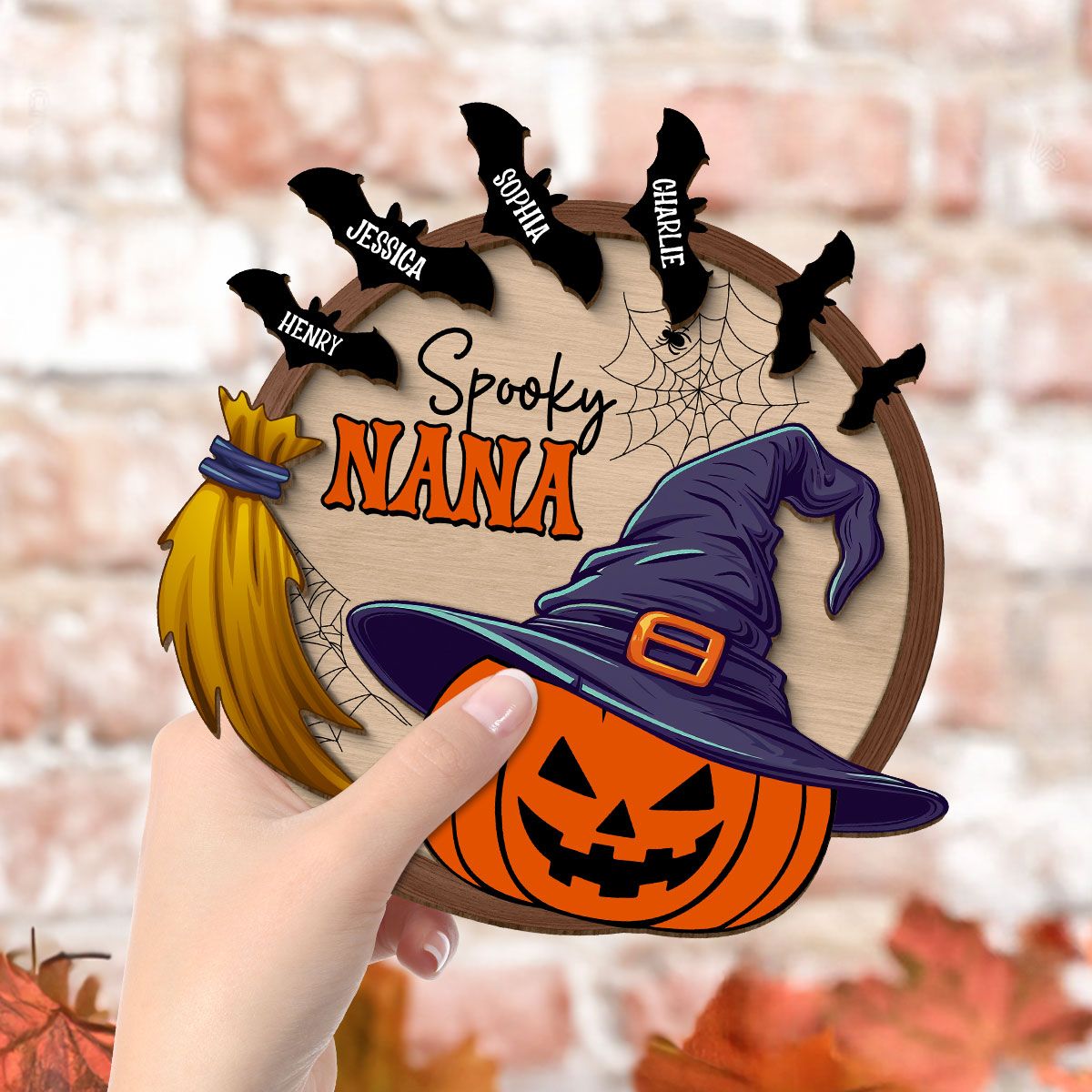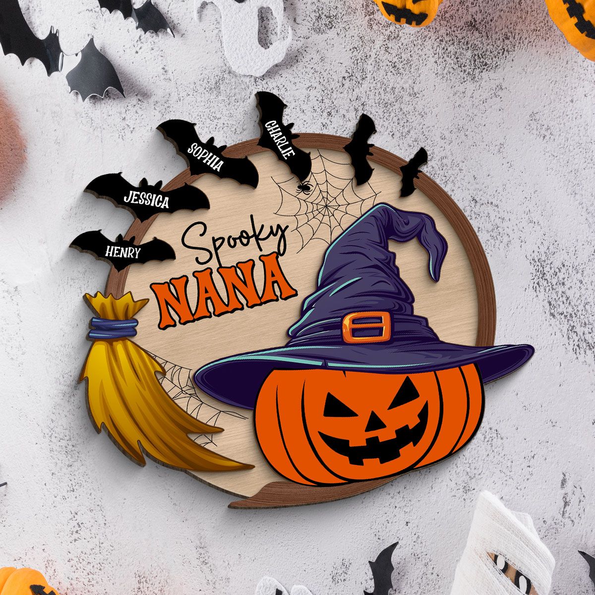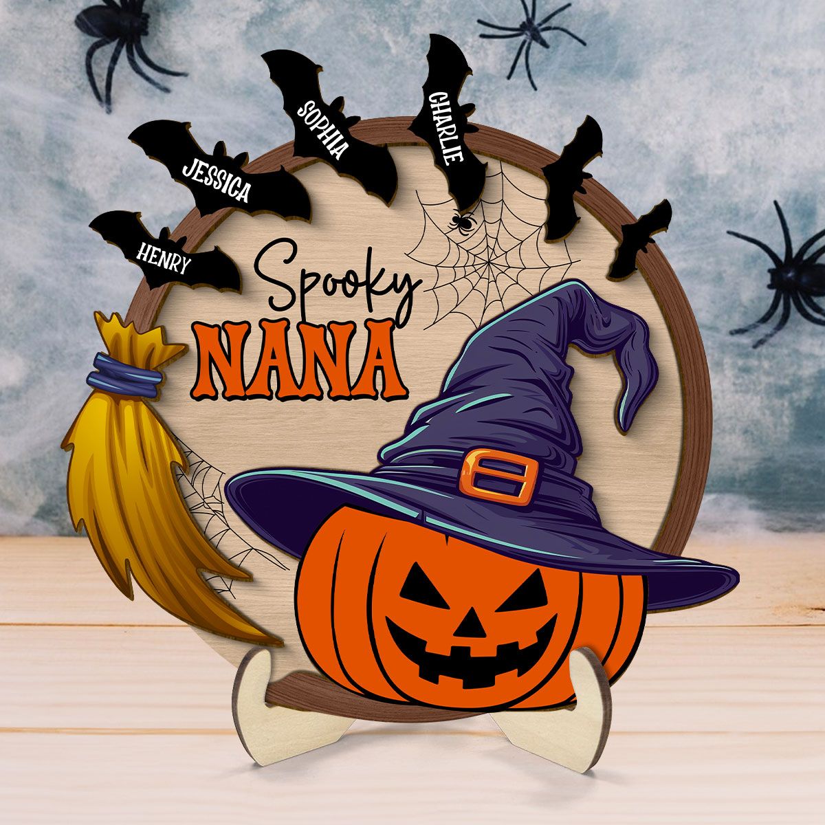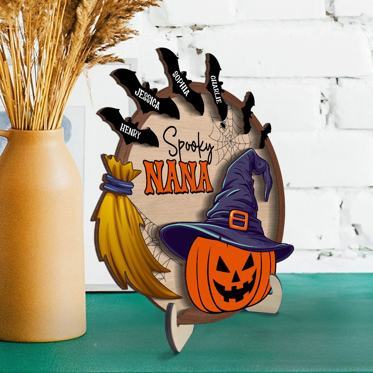 Spooky Grandma Mom Pumpkin Witch Hat Personalized 2-Layer Standing Wooden Plaque, Halloween Decor