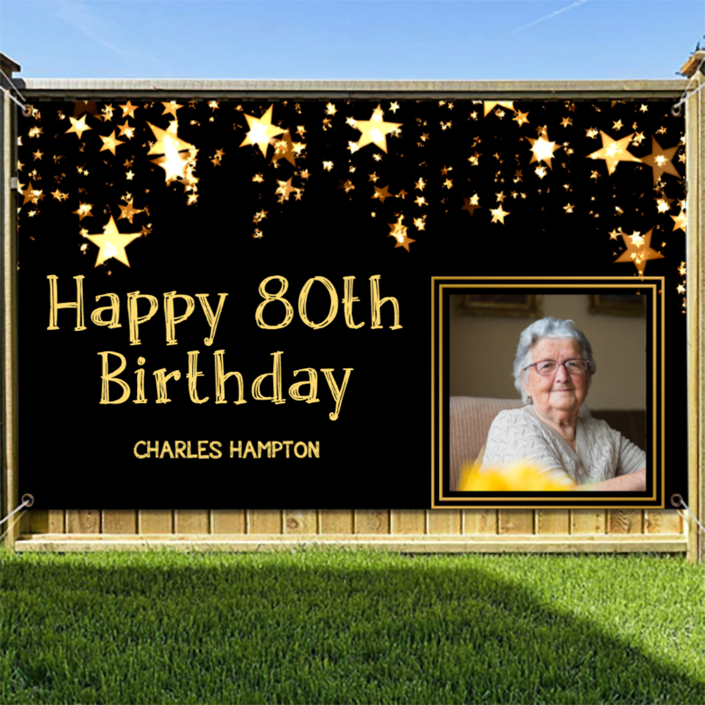 Custom Photo Brithday Banner Black Gold Stars Personalized Banner