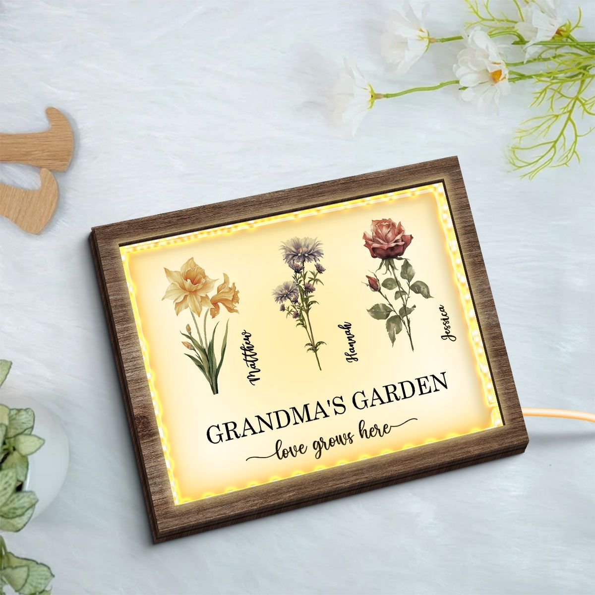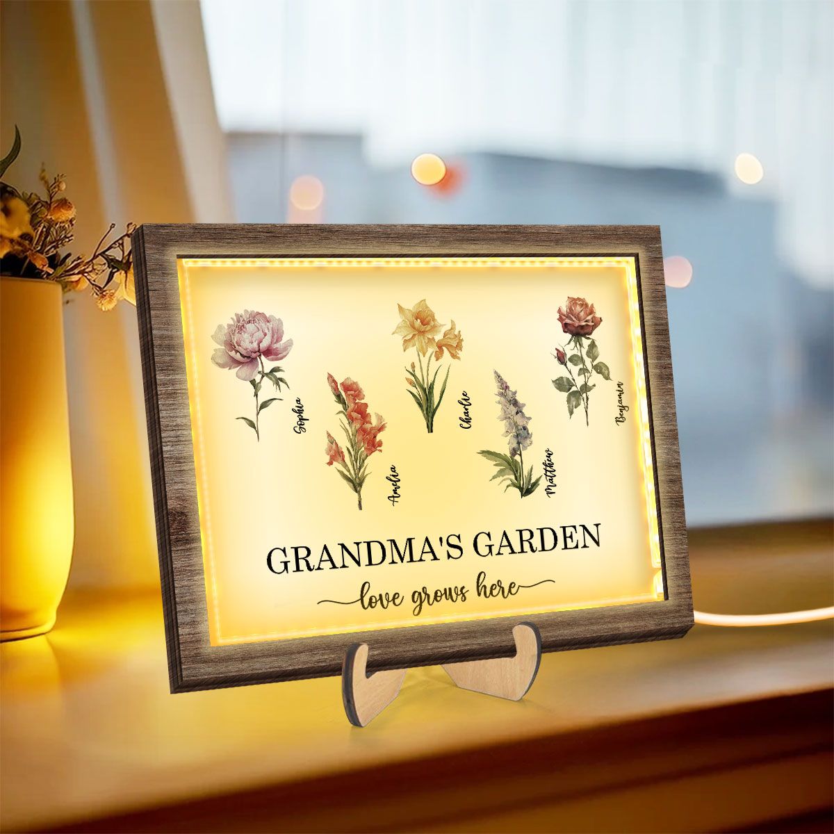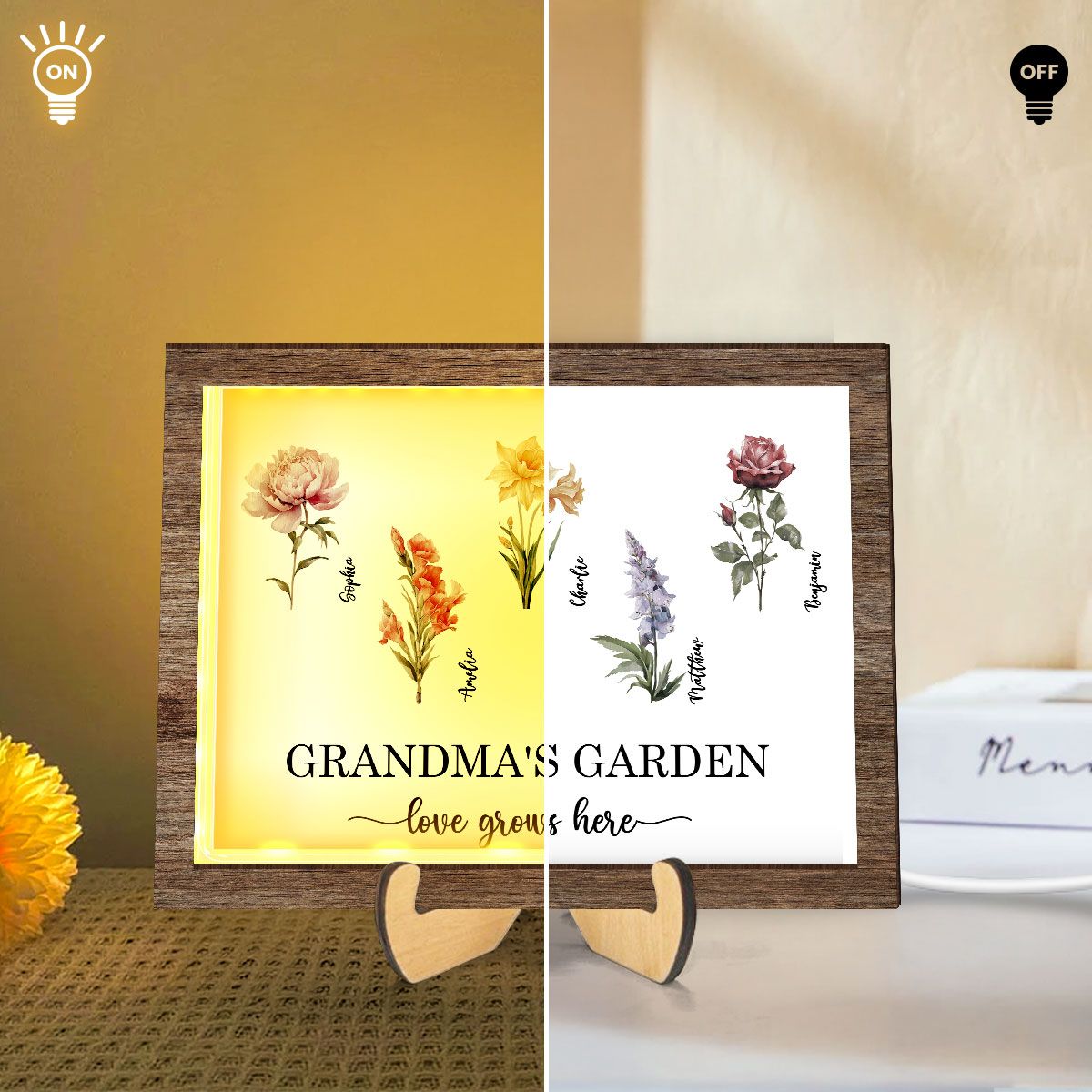 Grandma's Garden Love Grows Here Birth Month Flower Personalized 2-Layered Wooden Frame with LED, Heartfelt Mother's day gift for Grandma, Mom