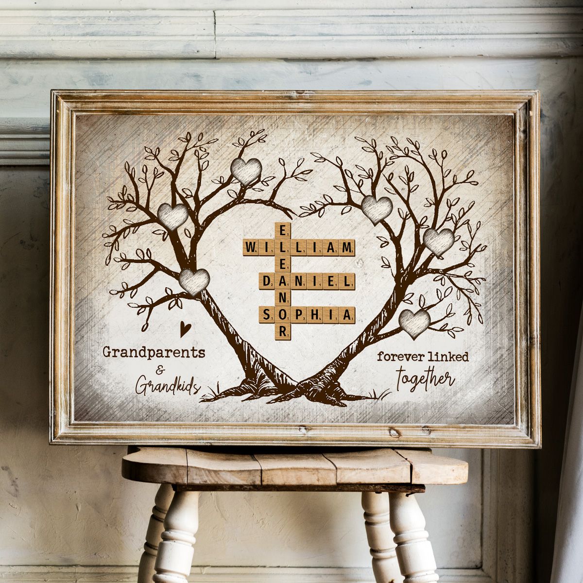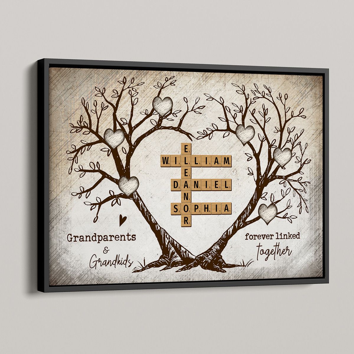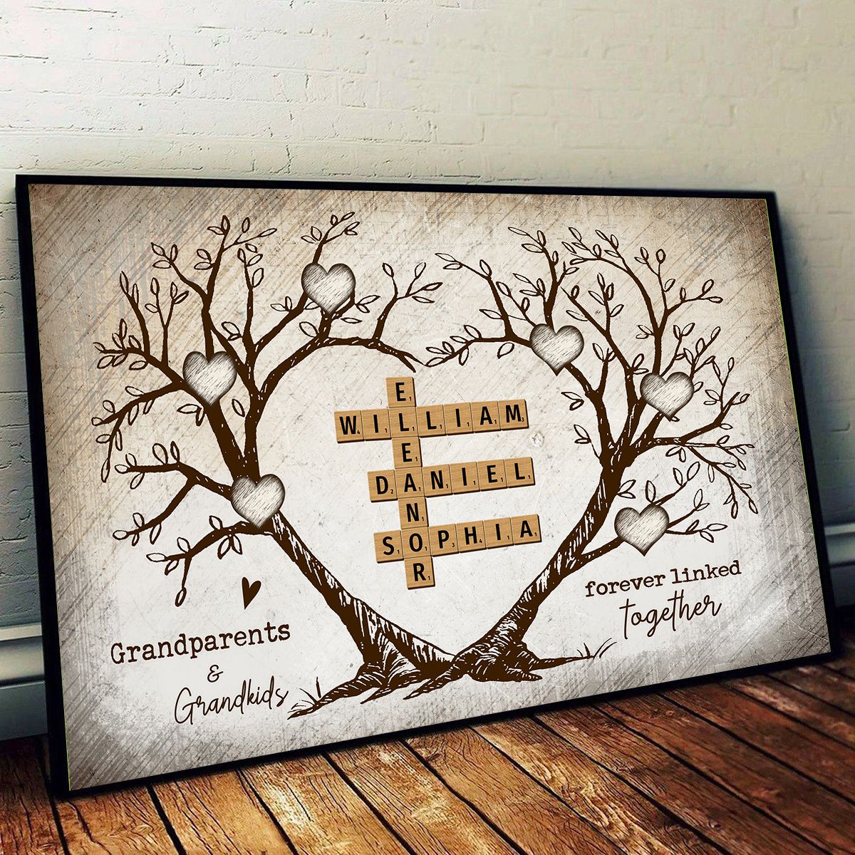 Grandparents & Grandkids Forever Linked Together Heart Tree Puzzle Crossword Art Personalized Canvas, Gift For Grandparents, Grandma, Grandpa