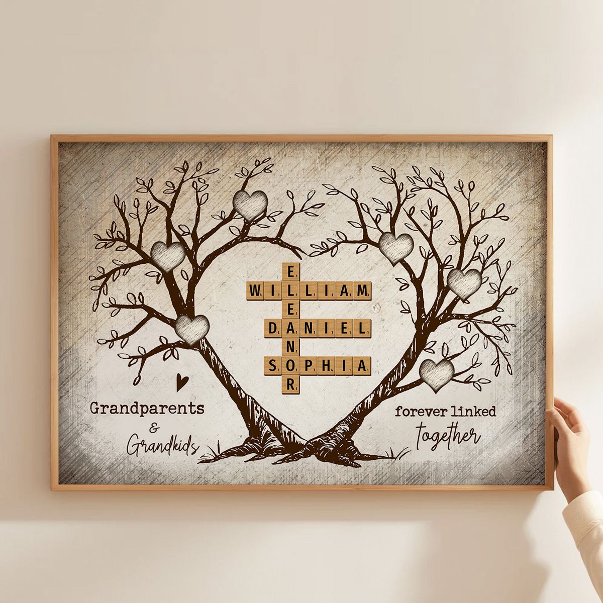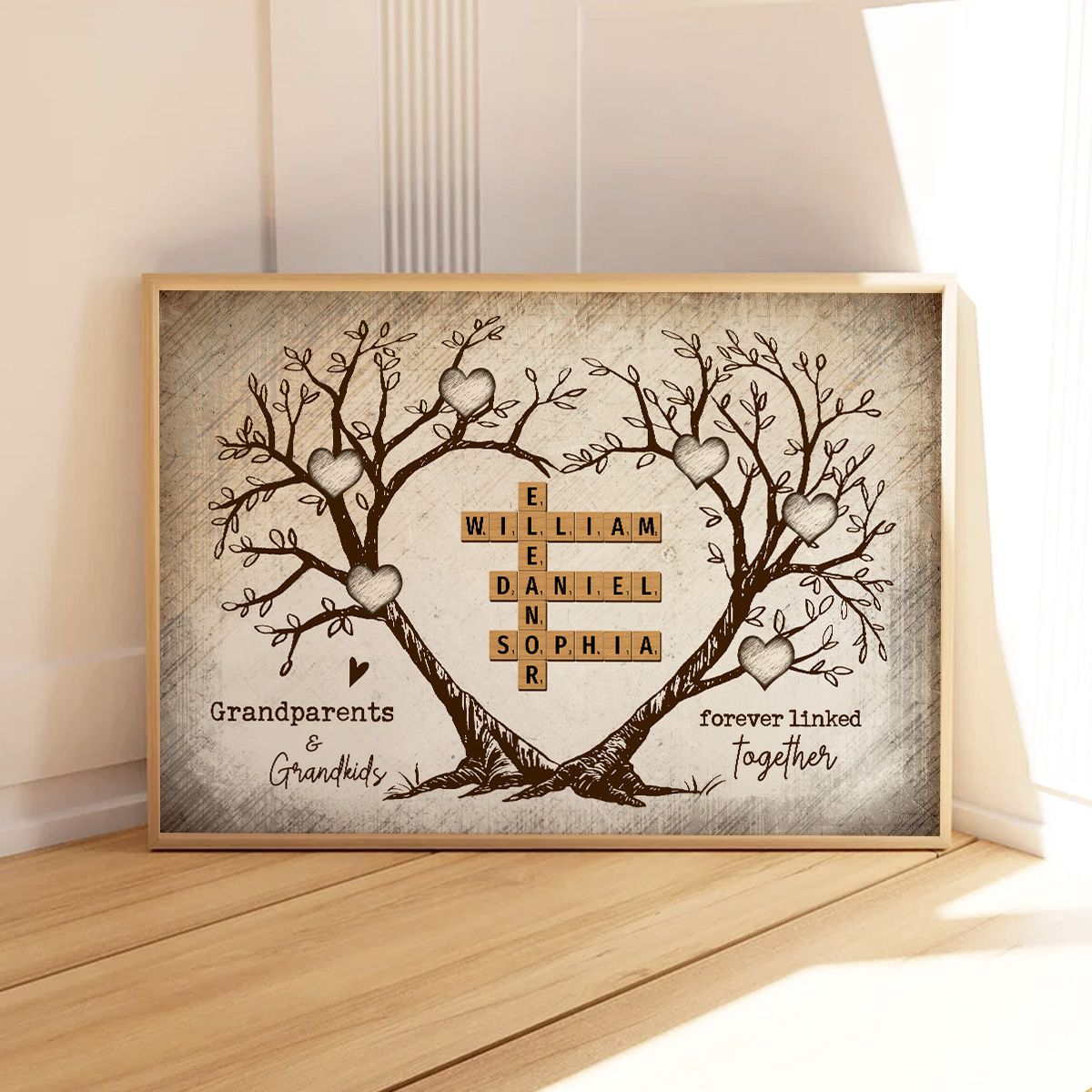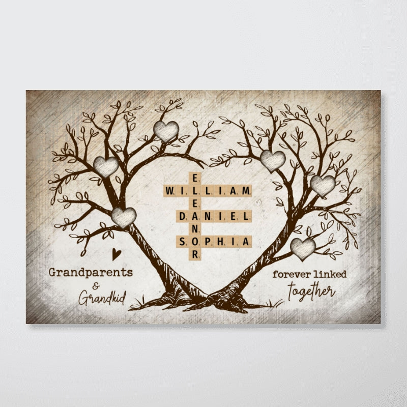 Grandparents & Grandkids Forever Linked Together Heart Tree Puzzle Crossword Art Personalized Canvas, Gift For Grandparents, Grandma, Grandpa