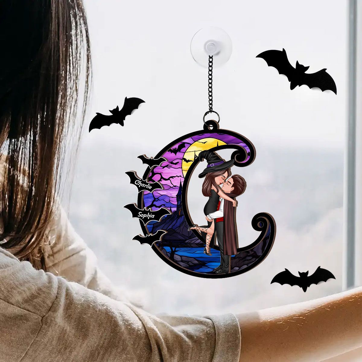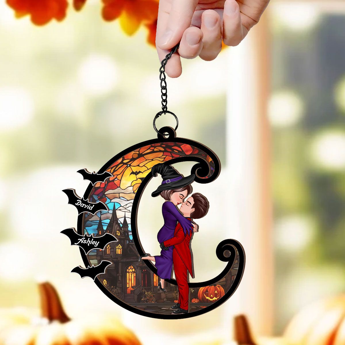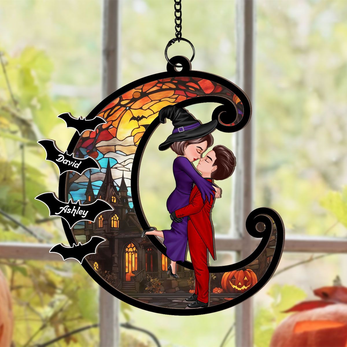 Halloween Couple Hugging Kissing On Moon Personalized Suncatcher, Halloween Decor