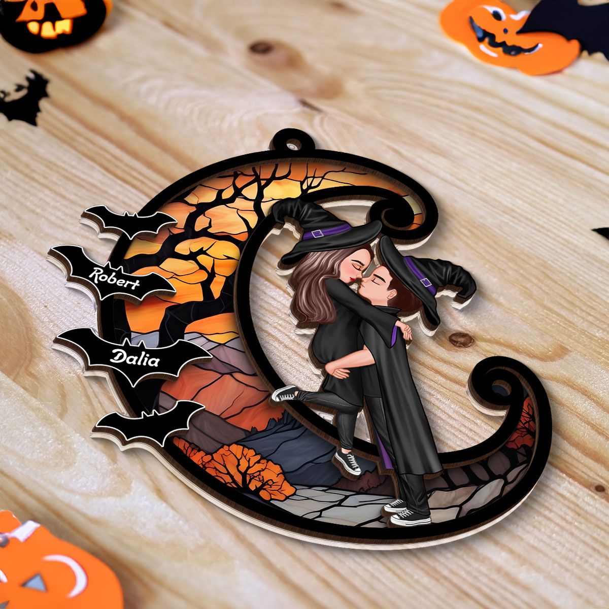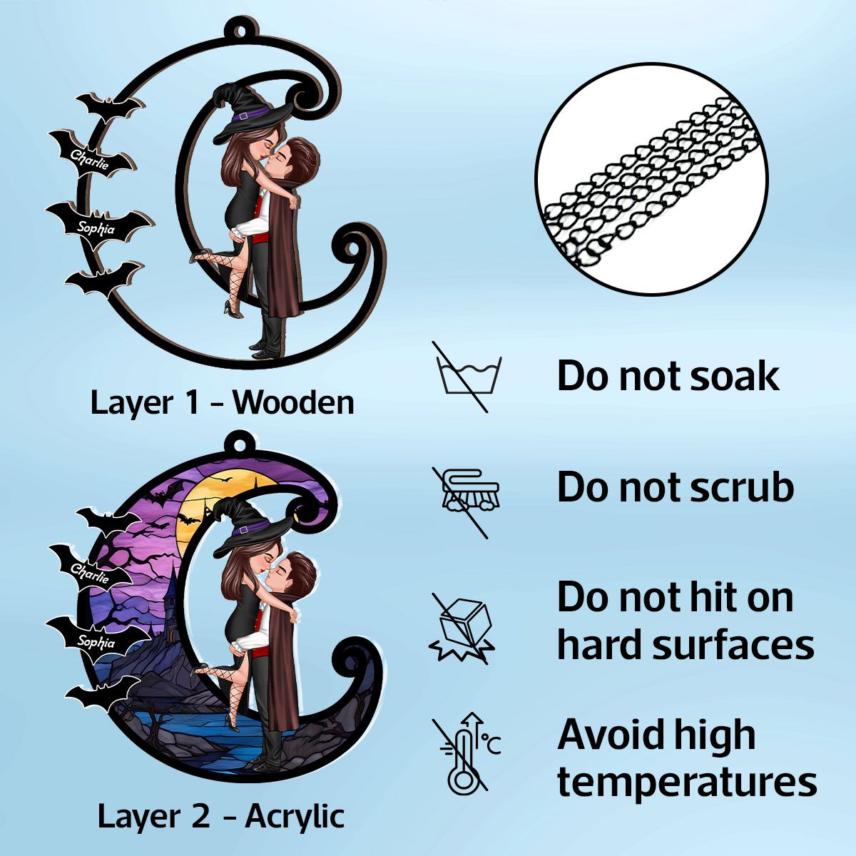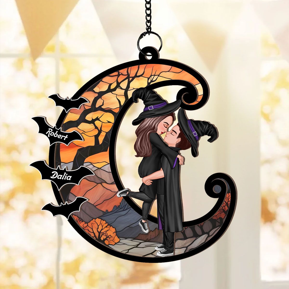 Halloween Couple Hugging Kissing On Moon Personalized Suncatcher, Halloween Decor