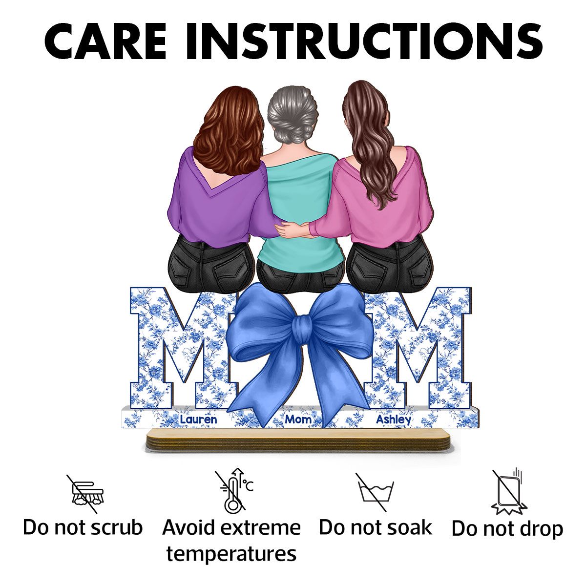 Mother Daughters Blue Floral Chinoiserie Personalized Standing Wooden Plaquer, Mother's Day Gift