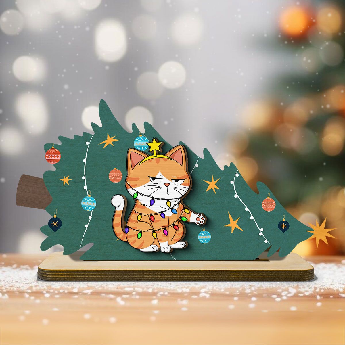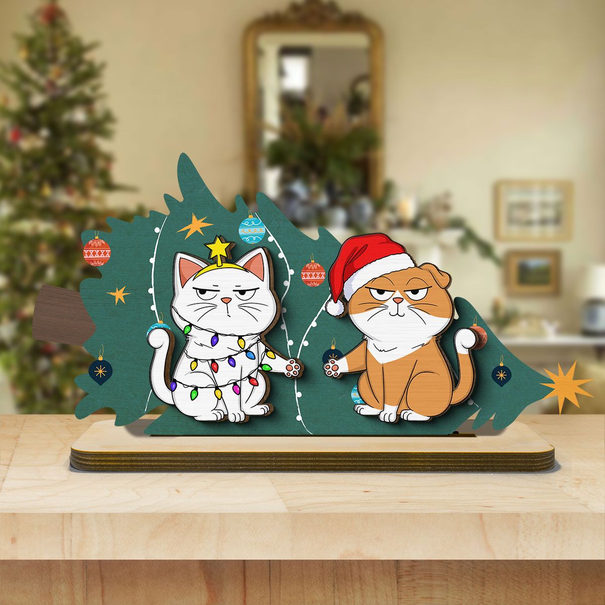 Naughty Cats Fallen Christmas Tree Personalized 2-Layer Standing Wooden Plaque