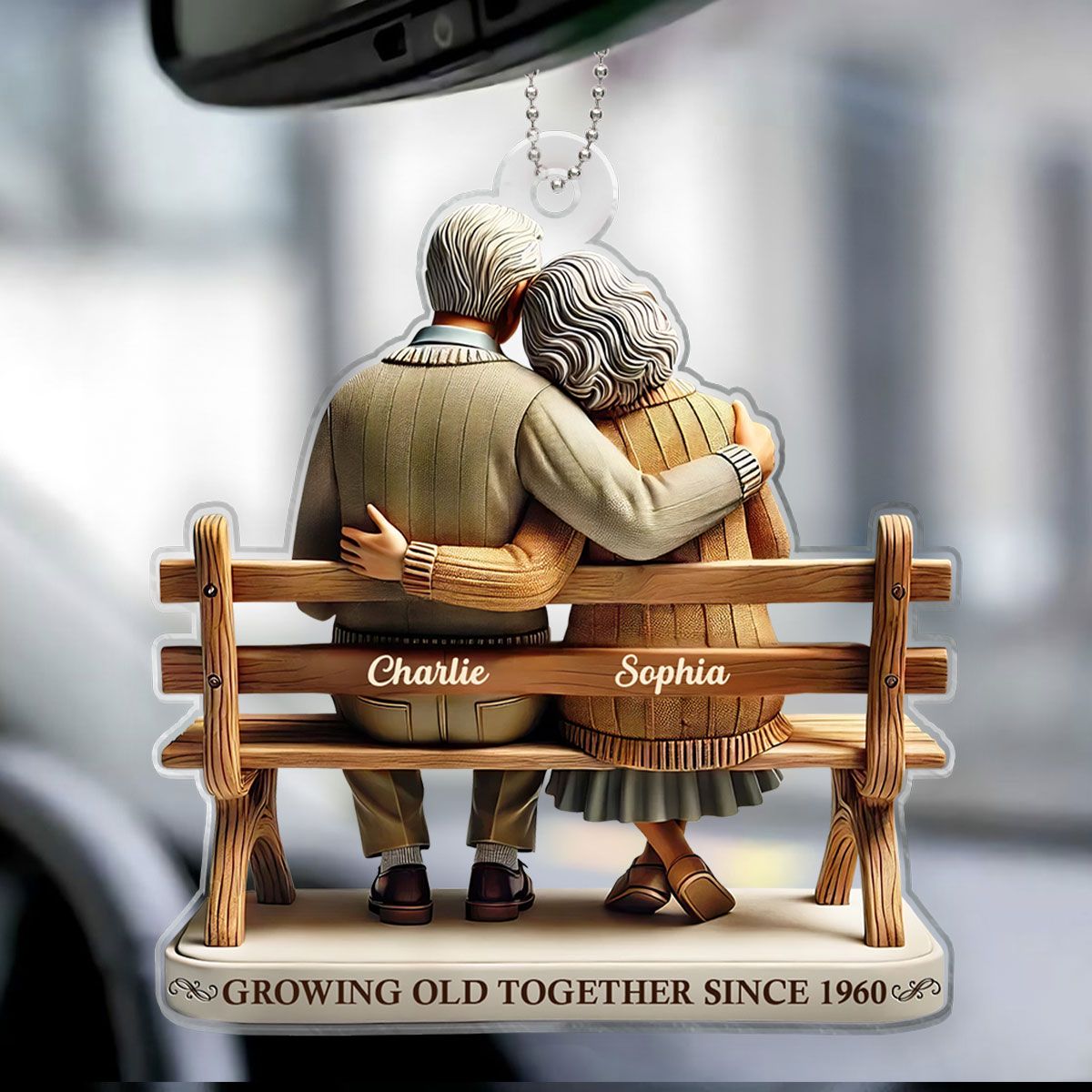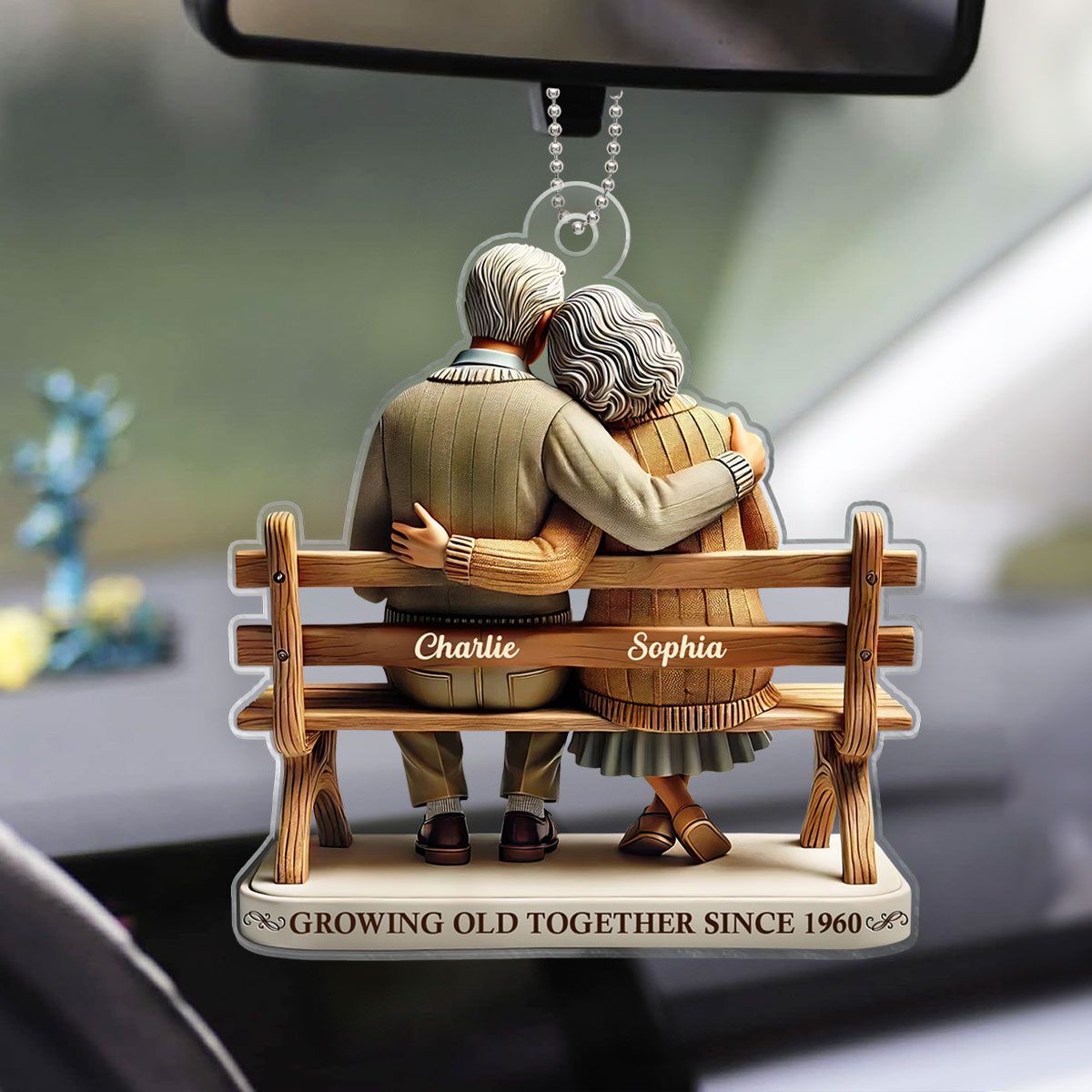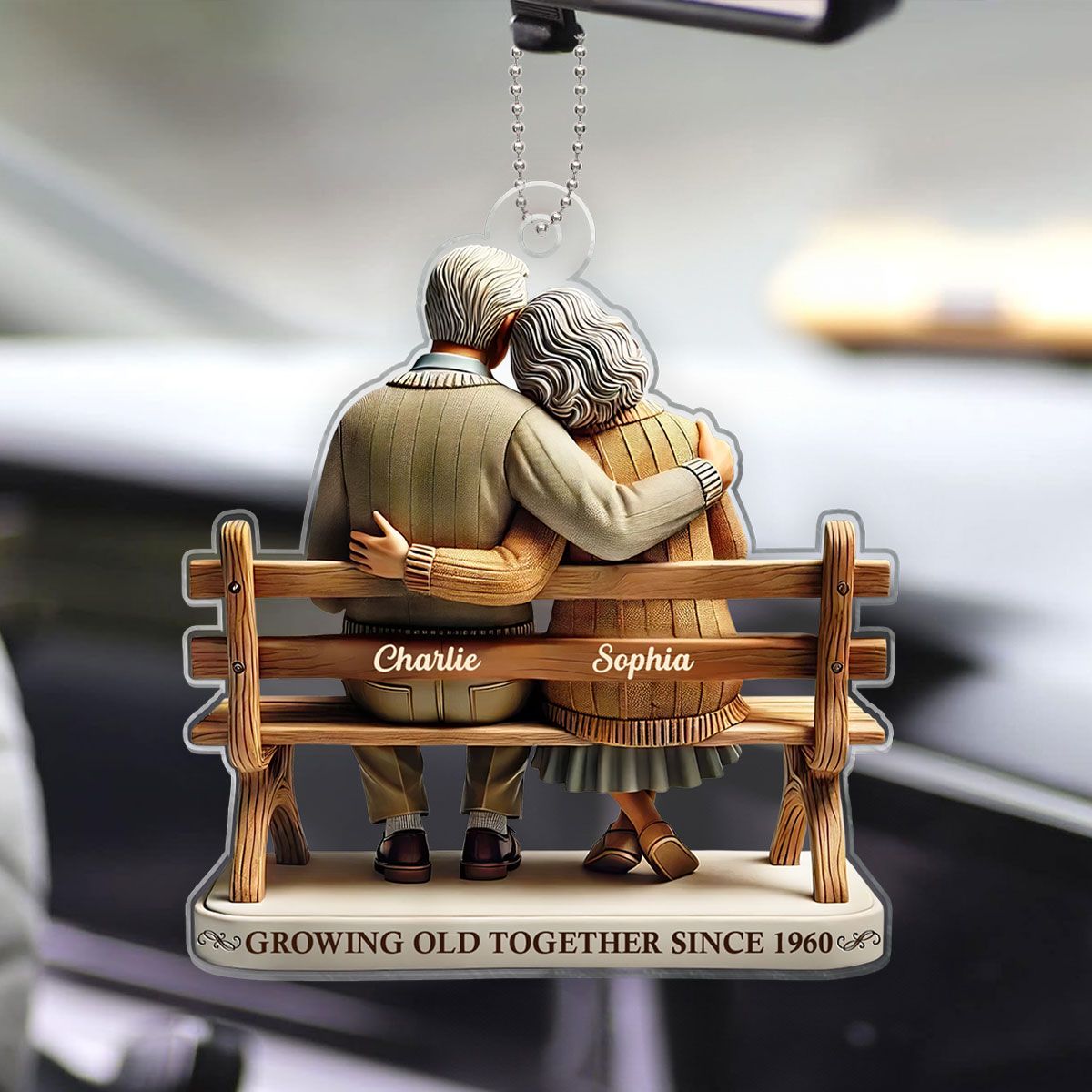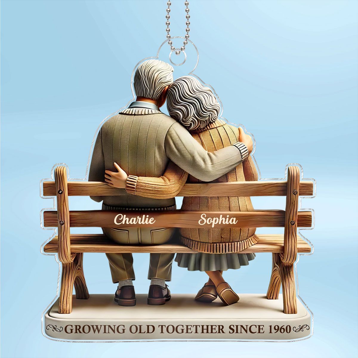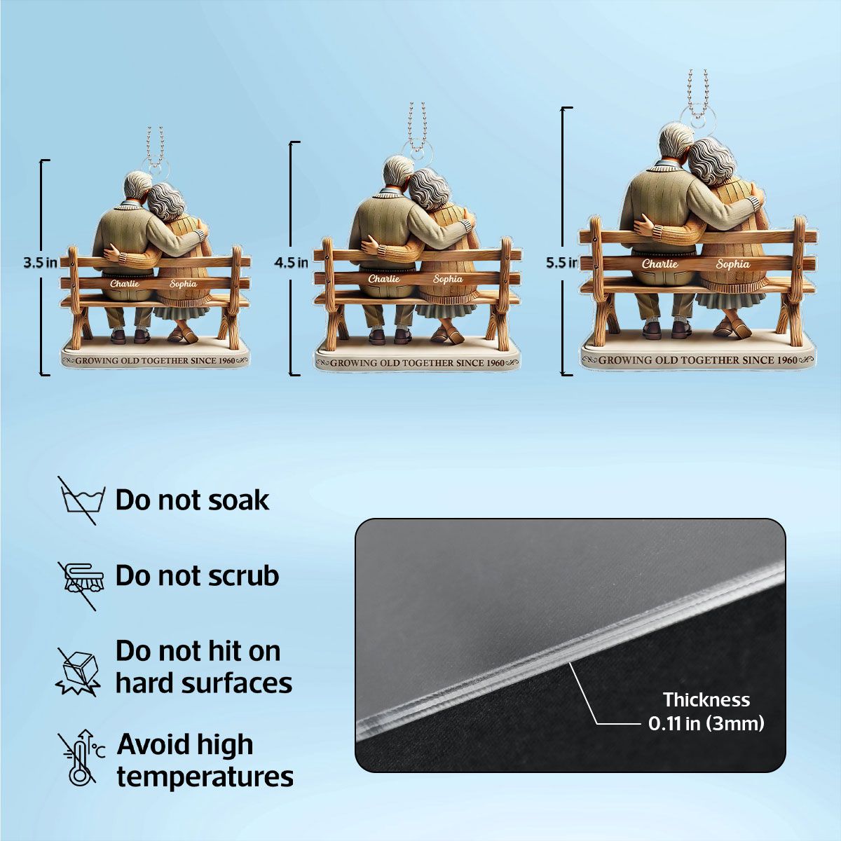 Old Couple Sitting On Bench Growing Old Together Since Personalized Car Hanger Ornament, Heartfelt Gift For Couple, For Him, For Her, Husband, Wife