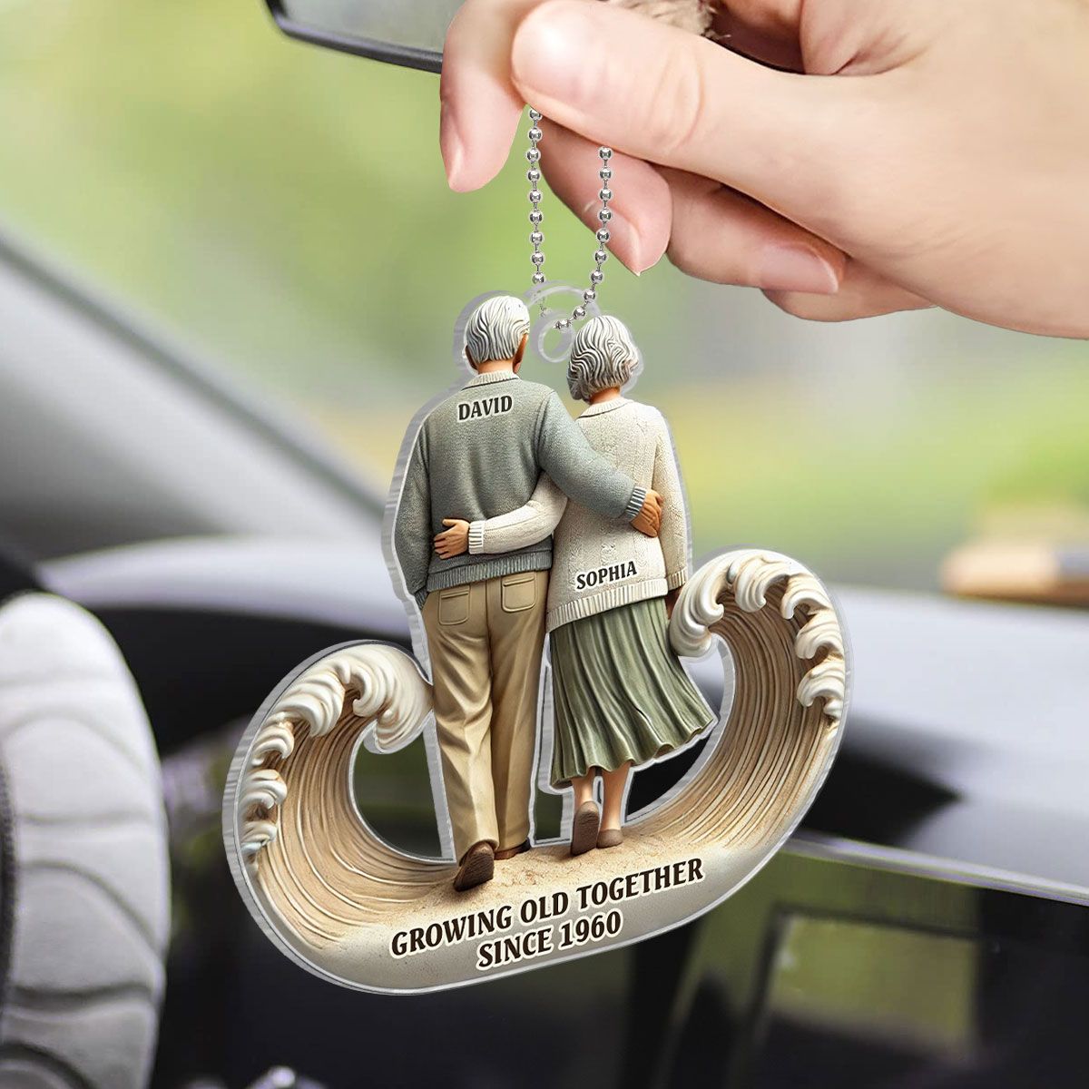 Sea Waves Old Couple Walking Together Personalized Car Hanger Ornament, Heartfelt Gift For Couple, For Him, For Her, Husband, Wife
